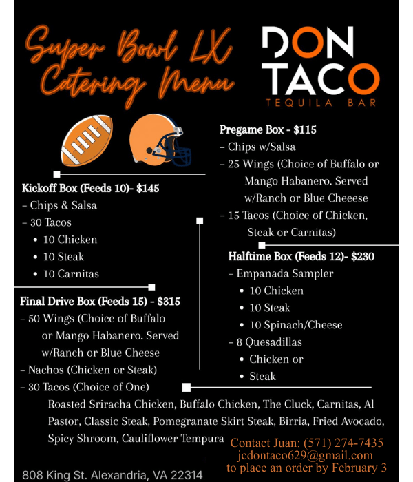 📍 Pickup Location: Don Taco – 808 King St, Alexandria, VA